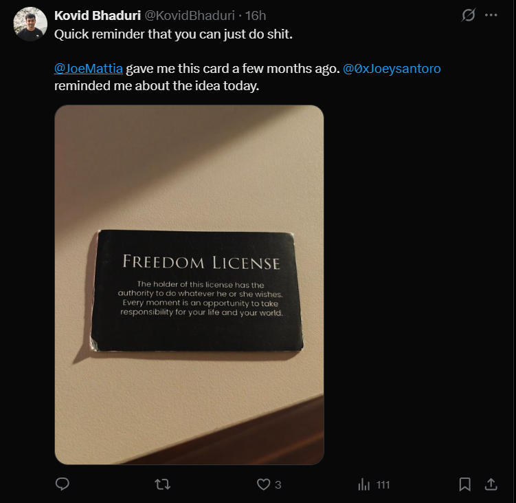 There’s a piece of paper sitting somewhere in my things. A “freedom license” I received a few months ago. At the time, it felt like a nice memento from an event, something clever and metaphorical. The message was simple: you don’t actually need permission to get things done. You can just do things.